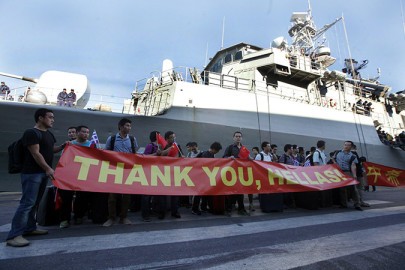 Groups of 20-25 evacuees were ferried to the Greek frigate on two Libyan tugboats escorted by members of the Hellenic Navy’s commando unit known as DYK.