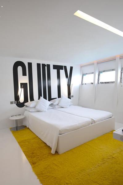 Artwork by Sarah Morris hangs over the bed and looke more like the scene of a crime.