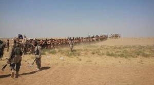 In the video the Assad soldiers are wearing only their underwear and walk barefoot in the desert, while Next armed jihadists walking next to them. One of the rebels appears to be holding the flag of the organization of the Islamic State, while the cameraman of jihadists acts like a shepherd leading the sheep wanting this way to humiliate the Syrian soldiers.