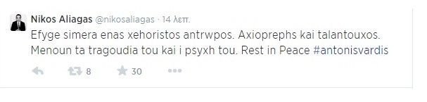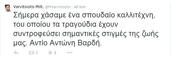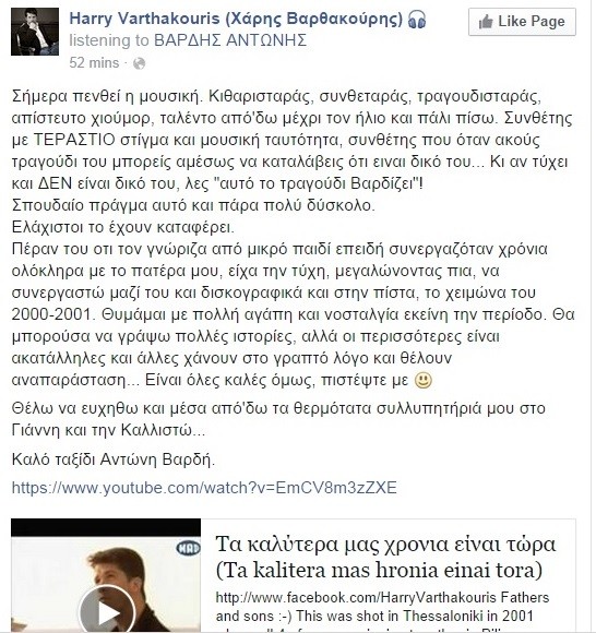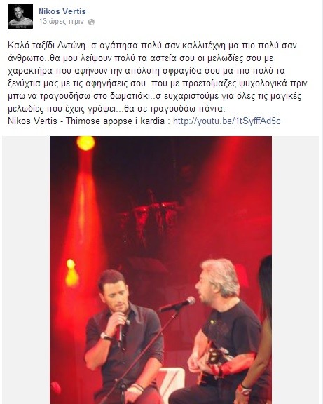 Many artists posted messages on their accounts on the Internet expressing their sorrow for the death of the great composer Antonis Vardis, such as Antonis Remos, Vasilis Papakonstantinou, Dimitra Galani, and many others.