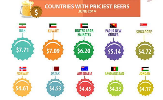 On the other hand, the most expensive beers can be found in the Middle East where you can enjoy a pint only in expensive places, since alcohol consumption is prohibited by the law. A bottle of beer costs $7.71 in Iran, $7.09 in Kuwait, $6.20 in the United Emirates, $5.14 in Papua, $4.72 in Singapore, $4.61 in Norway, $4.53 in Qatar, $4.45 Australia, $4.33 in Afghanistan and $4.17 in Jordan, whereas in Greece a bottle of beer costs about $ 1.50.