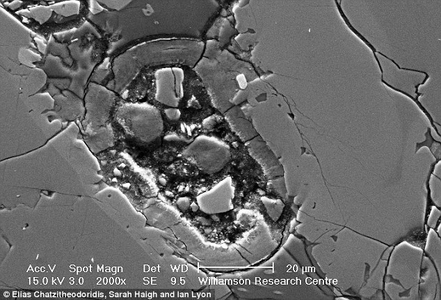 Greek scientists of the National Technical University of Athens, led by Elias Chatzitheodoridis, found an unusual feature in the rock that was an egg-shaped structure made of iron-rich clay and containing a variety of minerals. They found that the rock once held water that was heated and boiled away, possibly as the result of an asteroid impact.
