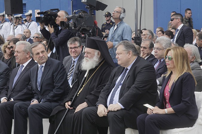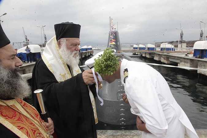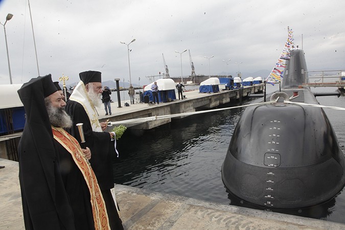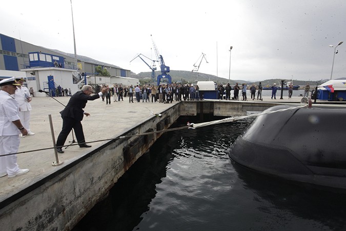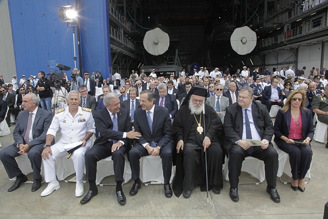 The launching and naming ceremony of “Pipinos” submarine took place on Monday at the premises of the Hellenic Shipyard at Skaramanga, Attica, in the presence of Prime Minister Antonis Samaras, Deputy Prime Minister Evangelos Venizelos and many other important political personalities, including Minister of National Defence Dimitris Avramopoulos, Minister of Shipping Miltiadis Varvitsiotis, Speaker of the Hellenic Parliament Evangelos Meimarakis, Public Order Minister Vassilis Kikilias, Alternate Minister of National Defense Fofi Gennimata and Archbishop Ieronymos.