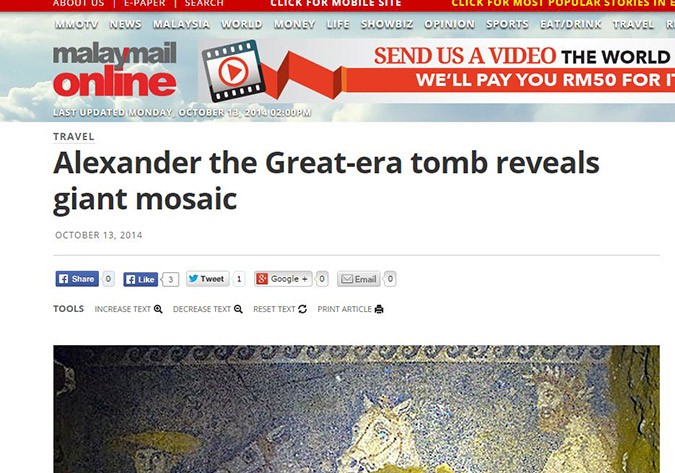 “The tomb of Alexander the Great reveals giant mosaic” is the title of Malaysian newspaper «themalaymailonline.com».