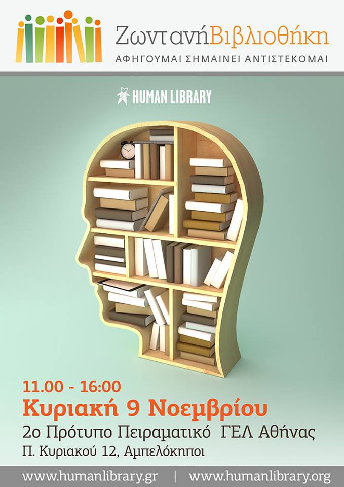 The Human Library is an international initiative and a place where people can borrow other people instead of books. These courageous people who have been subjected to stereotyping and prejudices open up about their experiences. People of the Human Library stand by their convictions and discuss their values and share their wisdom. The Greek branch of the Human Library is open to Greeks at the 2nd General Lyceum of Ambelokypoi at 12 Kyriakou Street, Ambelokipoi, from 11 a.m. to 4 p.m. on November 9 at 12 P. Kyriakou St. Ambelokipoi.