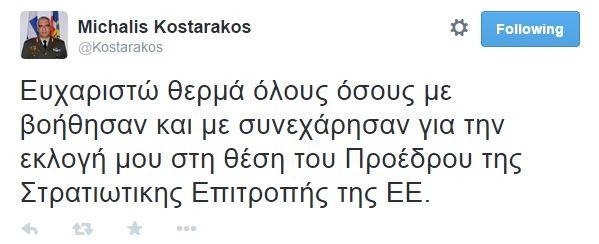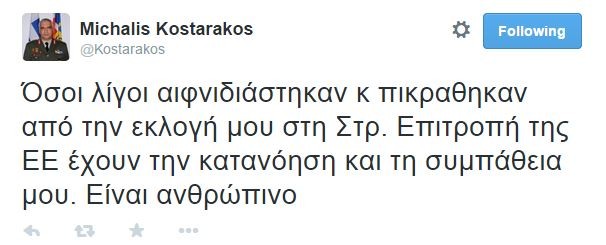 General Michalis Kostarakis posted a message on twitter to those who got … disappointed with his election