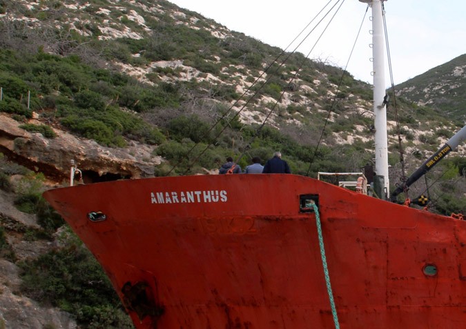 The 55-meter Palau-flagged freighter was discovered moored stern in the gulf of Porto Vromi with no member of the crew in sight. Hundreds of boxes of contraband cigarettes were found by the Coast Guard on the ship which is called Amaranthus.