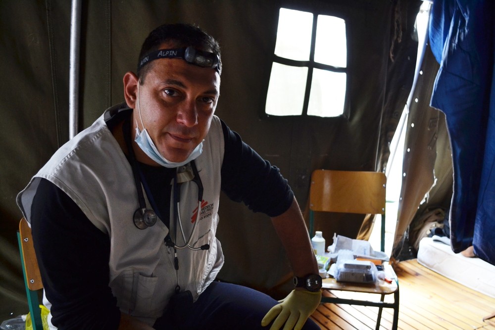Dr. Janussus at a tent at the Police Station of Kos is used as a bedroom and health screening room at the same time, due to lack of proper facilities