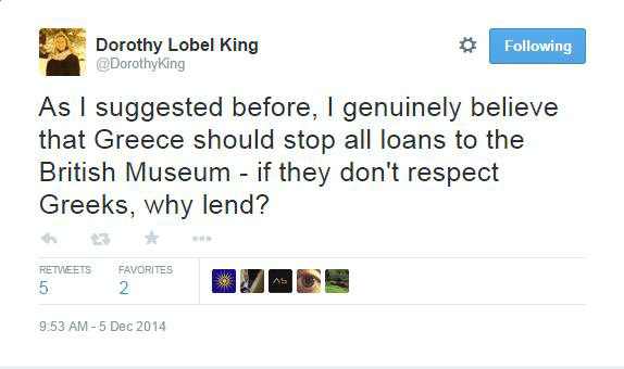 Dorothy King, an American archaeologist and historian who lives and works in England accused on Friday the British Museum of hypocrisy, stating that its decision to loan one of the Parthenon marbles to the Hermitage Museum in St. Petersburg insults Greece.