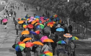 The people taking part in the walk held up umbrellas, symbolic of an intent to keep the new construction clean.