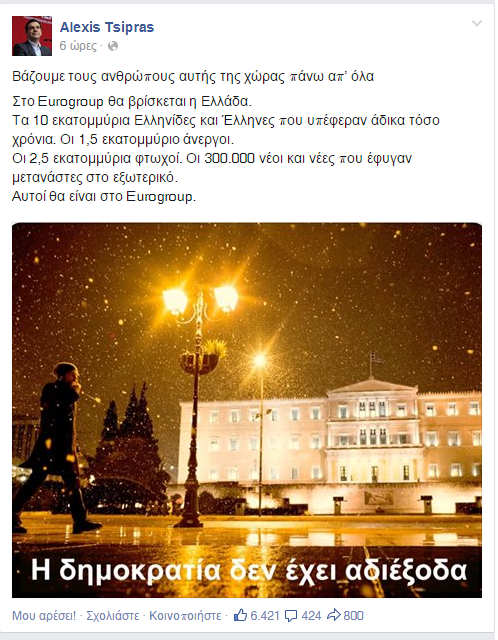 Shortly after the crucial government ratification vote in Parliament in the early morning hours, Prime Minister Alexis Tsipras wrote on his Facebook, with a picture of the “snowy” Parliament. He titled it: “Democracy has no dead-ends”. The photo and title was also accompanied by the following text, which was an excerpt of his parliament speech.
