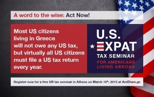 The American-Hellenic Chamber of Commerce is organizing an expat tax seminar in Greece for Americans living abroad. The free seminar by an expert on expatriate tax issues provides an excellent opportunity for anyone interested in the unique tax filing and bank report obligations of United States citizens working or living abroad. The presentation will be followed by a Q&A session. Topics to be covered include: