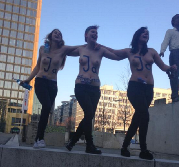 The three women sent their own message to Bundestag — “Ja” written on their bare chests.