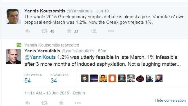 Analyst Yannis Koutsomitis Tweeted a statement on the Greek economy by saying: “The whole 2015 Greek primary surplus debate is almost a joke. Varoufakis’ own proposal end-March was 1.2%. Now the Greek gov’t rejects 1%”.