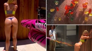 Gummy Bears everywhere. A video recently “hit” the internet, with a Gummy Bear launcher shooting the jelly, delicious candy on the shapely curves of model Golden Moeras. The show was enhanced with another man showering the woman’s curvature with water. Enjoy:
