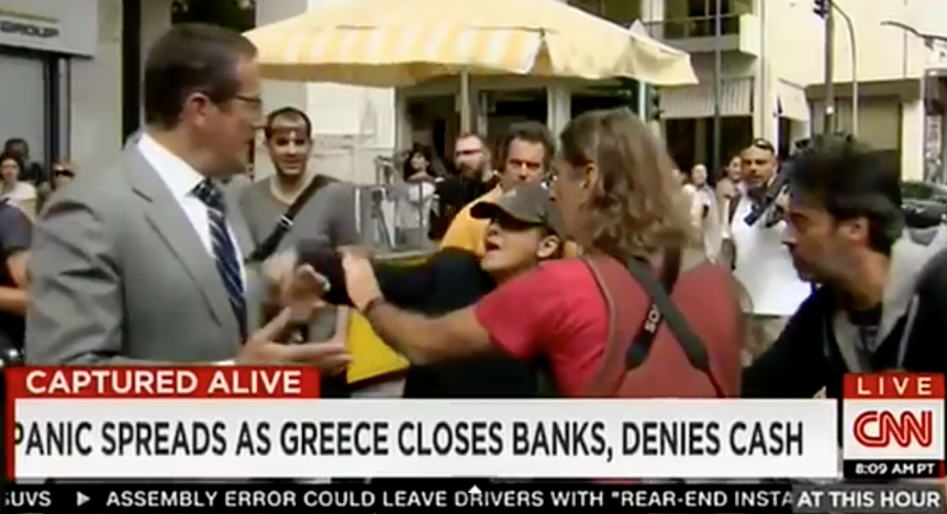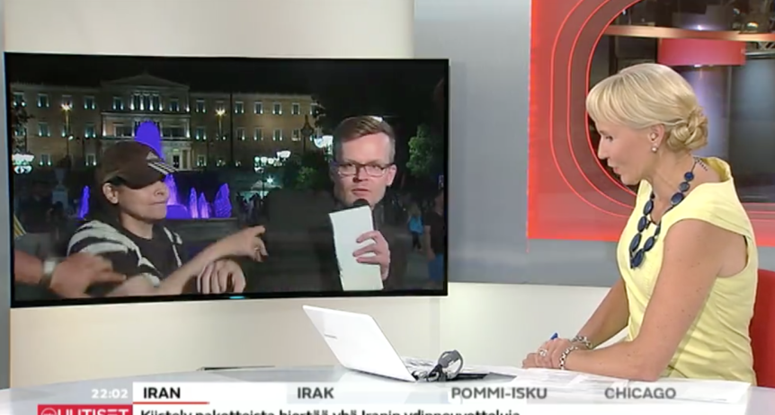 Janne Hopsu was interrupted during a live report from Syntagma Square on the Greek crisis with Finnish commercial broadcaster MTV3.