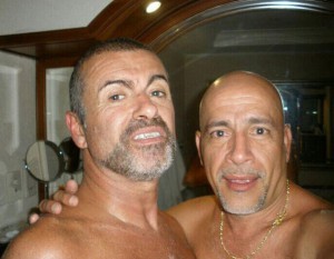 George Michael (aka Georgios Kyriacos Panayiotou) is happy, relaxed and topless with his Colombian-born hairdresser, Carlos, aged 52. The photos show both of them happy during their brief romance.