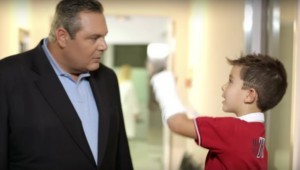 Seven months later, Kammenos escorts the young boy from the first ad to hospital – probably private bearing in mind there aren’t hospital beds in the corridors. He waits for little Alexis, who has broken his left arm (a reference to the split of anti-bailout hardliners from SYRIZA). Nobody knows why his mother trusted him to the man in the toy store or why he is alone at the doctors without anyone to comfort him. The boy comes out with a huge smile and his left arm in a cast and Kammenos promises to teach him to use his right arm.