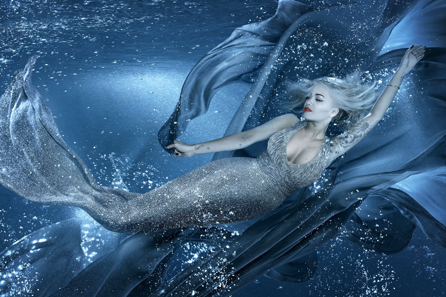 Rita Ora, aged 24, flaunts her cleavage as a mermaid in an underwater shoot so as to promote a new fish restaurant.