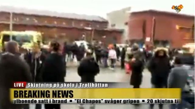 A masked man with a sword walked into a a school around 75km from Gothenburg, Sweden and killed a teacher while wounding four students at before being shot by police.