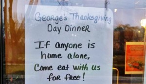 “George’s Thanksgiving Day dinner: If anyone is alone, come eat with us for free! All Day Thurs., November 26th.”