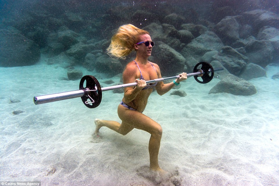 She said: ‘Everyone in Hawaii does underwater rock runs and underwater rock lifting. I’ve never seen anyone use actual weights in the water – I thought it would be an original concept.