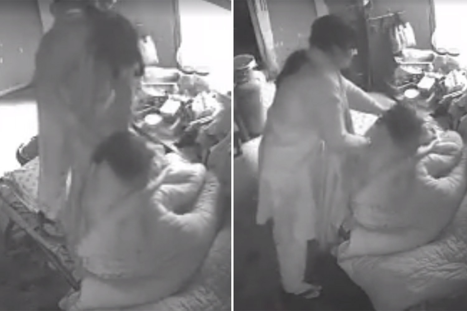 A woman appears on a video struggling her elderly mother-in-law and beating her with a brick.