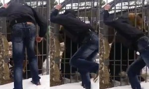 The footage was taken in Murmanskaya Oblast, in the country’s far north west and shows the man screaming out in pain as the bear clamps its teeth around his arm.