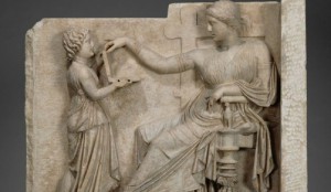 The funerary relief claims to be a scene from Pandora’s Box but the slave girl appears to be holding a tablet.