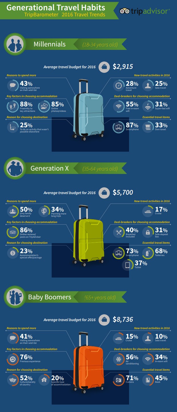 TripBarometer measures global travel trends among TripAdvisor customers and business owners and for this edition particular attention is paid to the needs and behaviors of three different generations – Millennials, Generation X and Baby Boomers when traveling for business and/or vacation.