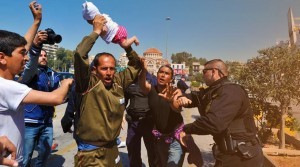 One immigrant took his baby and held him up over his head while heading towards the sea, an act which was perceived as an attempt to throw the baby into the sea! The incident ended with other refugees managing to take the infant from the hands of his father.