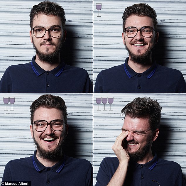 Alberti invited his and photographed them before having any wine, and then after one, two and three glasses. The results are amusing.