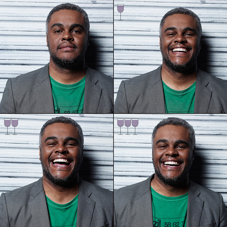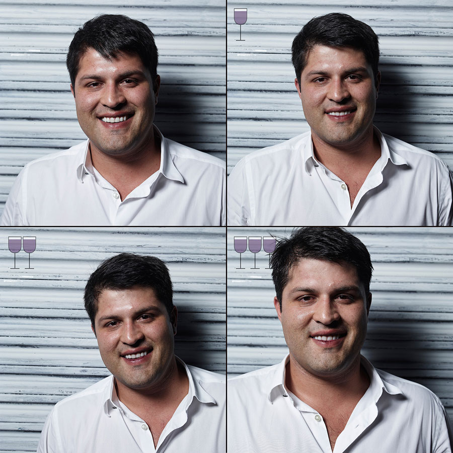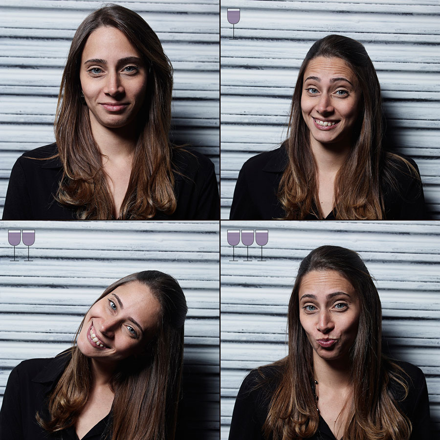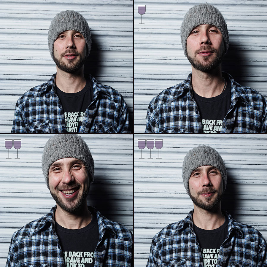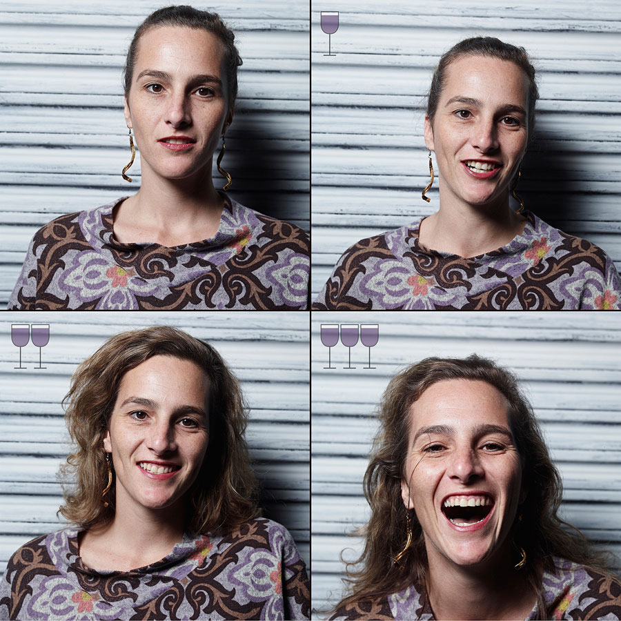 “The first picture is taken right away when our guest has just arrived at the studio in order to capture the stress and the fatigue after working all day long, and from also facing rush hour traffic to get here,” Alberti says. “Only then can fun time and my project begin. At the end of every glass of wine, a snapshot. Nothing fancy—a face and a wall, three times.”