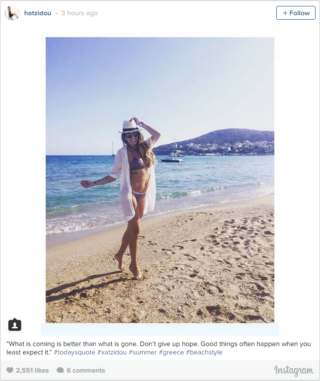 Sexy Greek singer Eleni Hatzidou posted a photo in her bikini on instagram, flaunting her toned body. In a frolicking mood, the singer was wearing a flowing white shirt over her bikini. The young singer included some words of optimism under her photo: “What is coming is better than what is gone. Don’t give up hope. Good things often happen when you least expect it’.