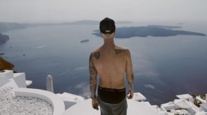 The clip opens with Bieber posing next to a statue and enjoying the view of Santorini.