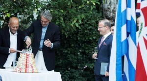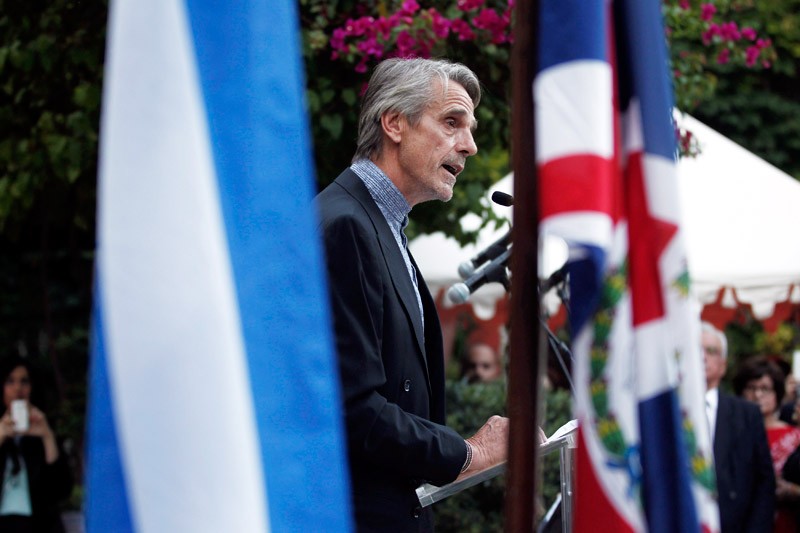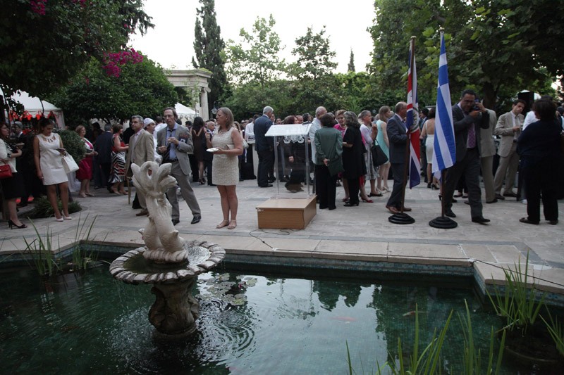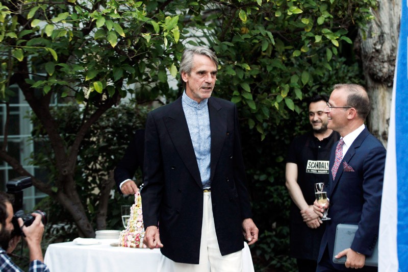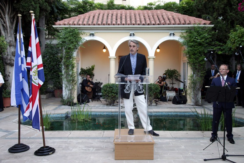Oscar winning British actor Jeremy Irons was in Athens on occasion of Queen Elizabeth’s 90th birthday and the 400th anniversary of the death of playwright William Shakespeare. Irons, who was guest of honour of the UK Embassy in Athens, recited a sonnet at the court of the building. The guests had the chance to marvel at the beautiful garden and the interior of the UK Embassy, while the UK national theatre costumes showcased at the Embassy drew the attention of the those present. The talented actor cut a 3-storey cake for the Queen’s birthday with the help of famous Greek culinary chef Stelios Parliaros.