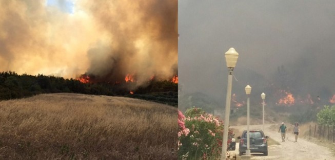 The fire reached residential areas burning warehouses. Many settlements have been evacuated for precautionary reasons, including the village Apolakkia, while fire service managed to put the fire under partial control at Isrios, Monolithos and Sianna settlements, after fighting the blaze for many hours, as the deputy mayor Agapitos Pallas told Rodiaki.