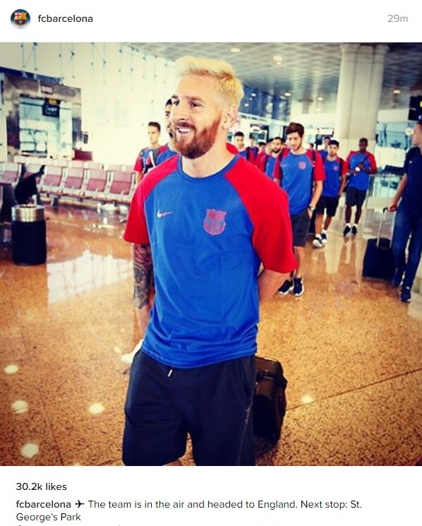 The new ‘blond Messi’ is on his way to England with the rest of his Barcelona team mates. The bleached Lio was on the pane next to Barcelona striker Luis Suarez, who commented on his social media profile: ‘We are taking off for England with my friend Messi and his new look’.