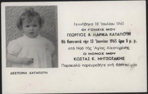 “I was born on 18th of July 1963. My parents are George and Marika Katapoti. I am going to be baptized on June 13th 1965, at 17.00 in Saint Catherine’s church. My godfather Costas C. Mitsotakis. Please attend my christening”.