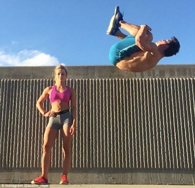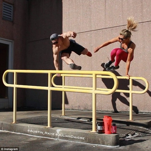 Ripped man and his very acrobatic girlfriend showcase insane partner workouts in jaw-dropping video that has been viewed 25 million times. Two fitness lovers have taken the internet by storm with their jaw-dropping compilation video that sees them doing everything from synchronized tumbling to complicated lifts. Austin Raye and his girlfriend Julian Daigre from New Orleans, Louisiana, have flipped their way into the hearts of millions thanks to their complex fitness routines that combine acrobatics and muscle endurance. The clip starts with Austin holding Julian in a plank position above his head as they do synchronized moves that engage their core muscles. The next bit of footage sees him tossing Julian to the top of a giant wall, which she starts to scale. Austin, who used to be a cheerleader in high school, easily picks her back up by her feet and begins pushing her up and down while she stands on his hands.