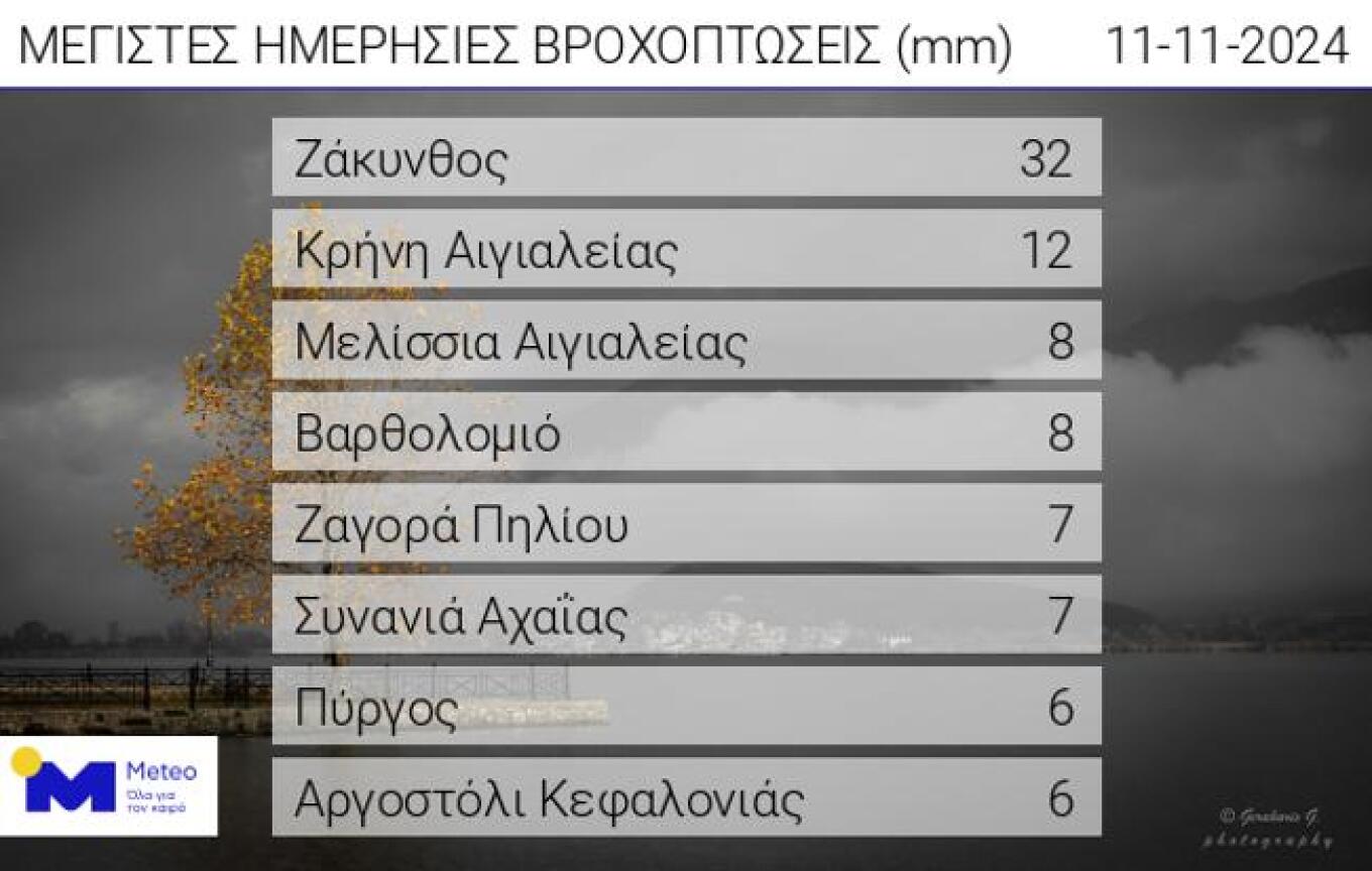 According to data from meteo.gr/National Observatory of Athens, the most significant rainfall on Monday, November 11, was recorded in Western Greece, particularly in the Ionian Islands. The table below shows the areas with the highest rainfall until 9 PM on Monday.