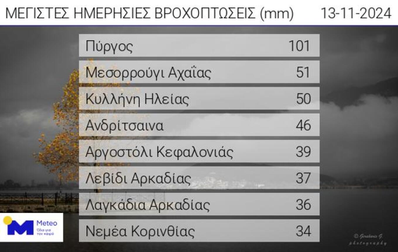 Thunderstorms affected Pyrgos, Ilia, from midnight until 7 AM on Wednesday, November 13, with a total rainfall of 101 mm, according to the automatic meteorological station of meteo.gr/EAA in the city. Significant rainfall levels were recorded in several areas of the Peloponnese and the Ionian Islands, according to the network of automatic weather stations of the National Observatory of Athens/meteo.gr. The top eight rainfall levels until 10 AM on Wednesday, November 13, are presented in the table below.