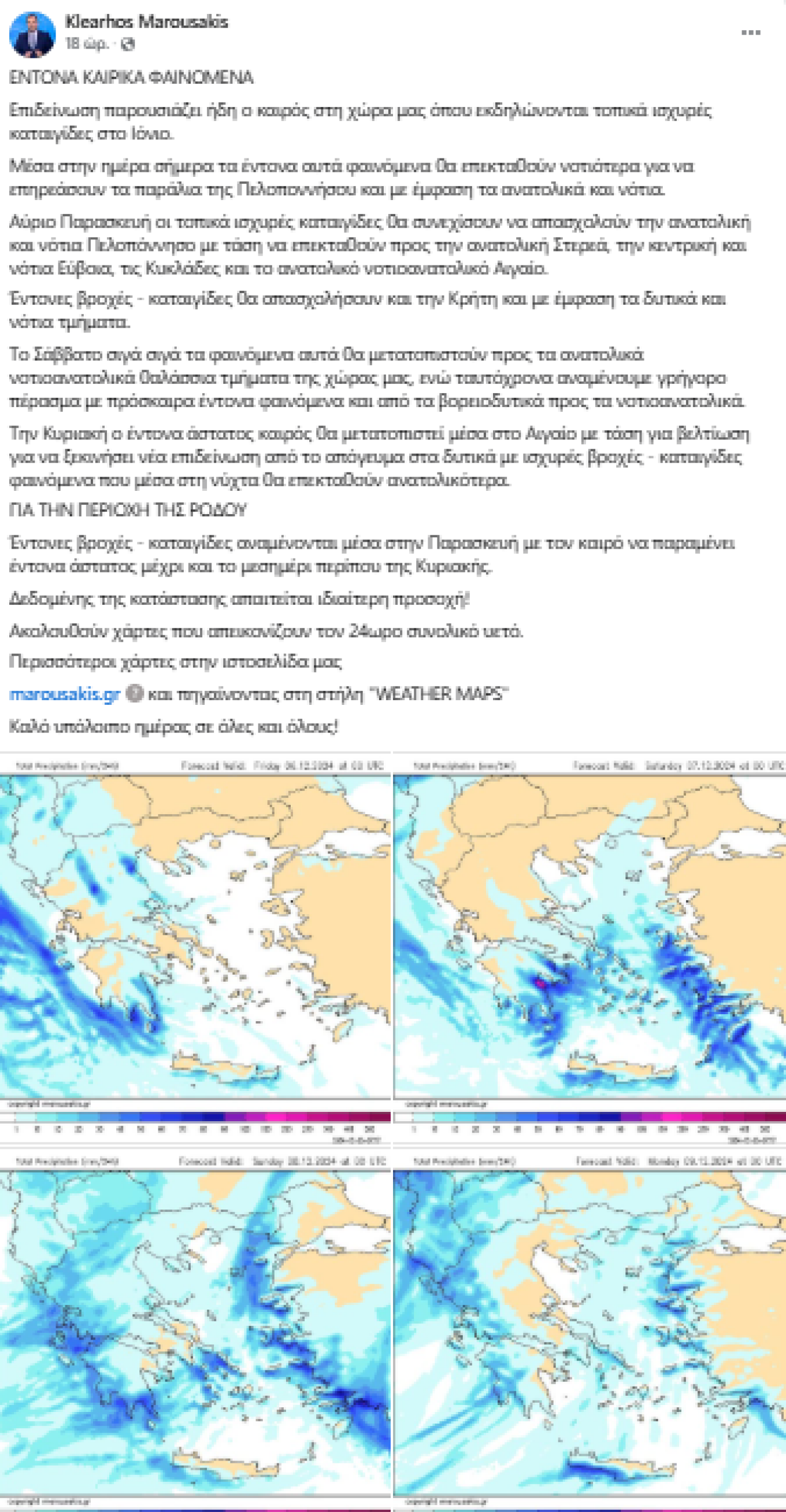 According to meteorologist Klearchos Marousakis, the storm will initially strike the southern and eastern Peloponnese, with intense phenomena expected in Messinia, Laconia, Arcadia, and Argolida. Significant volumes of rain are forecasted in these regions through Friday morning. The phenomena will then shift toward the Cyclades and the southeastern Aegean, continuing through Sunday. Particular attention is required for Rhodes, which was recently devastated by Storm Bora, causing extensive damage last weekend.