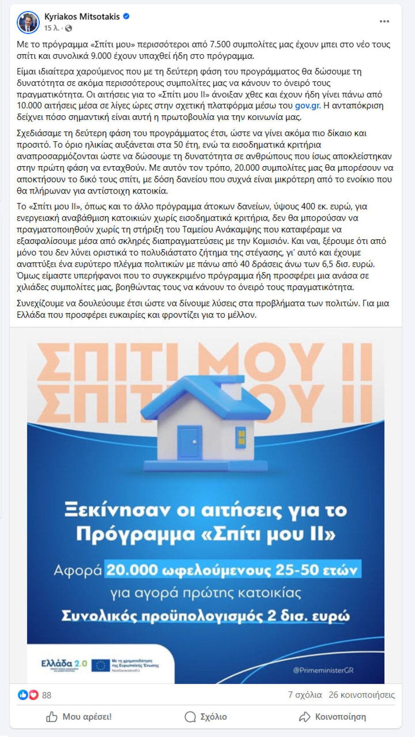 “With the ‘My Home’ program, more than 7,500 of our fellow citizens have moved into their new homes, and a total of 9,000 people have already joined the program. I am particularly happy that, with the second phase of the program, we will give even more of our fellow citizens the opportunity to make their dream a reality. Applications for ‘My Home II’ opened yesterday, and already more than 10,000 applications have been submitted on the relevant platform through gov.gr in just a few hours. The response demonstrates how significant this initiative is for our society.