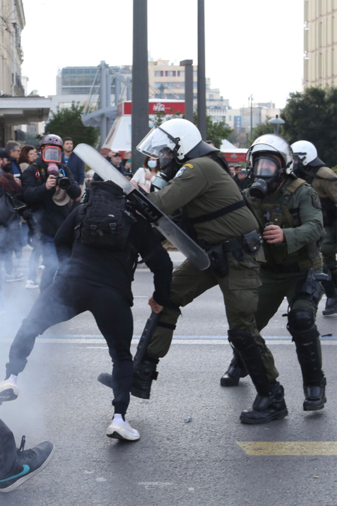 Just before 3:00 PM, the march at Syntagma Square for the railway tragedy in Tempi concluded. The crowd is dispersing from the gathering. Meanwhile, a clash is ongoing between hooded individuals and riot police at the Propylaea.