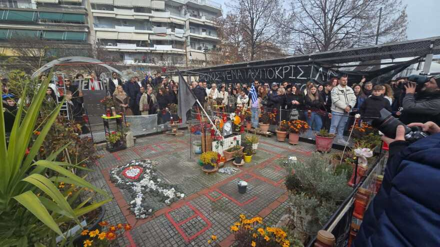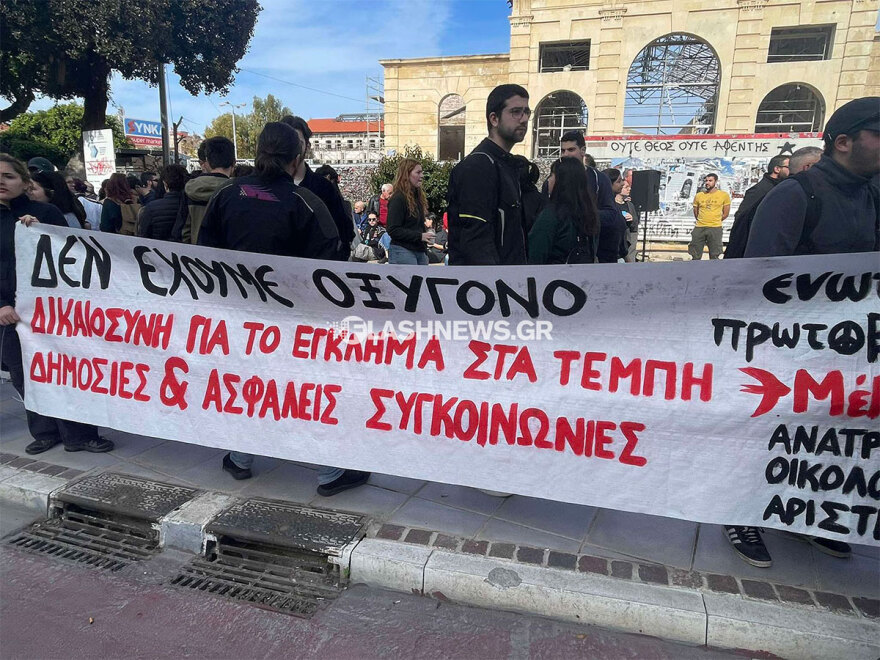 The protest in Larissa reached the OSE headquarters, with participants gathering at the memorial erected for the victims of the tragic Tempi accident, located opposite the OSE offices.