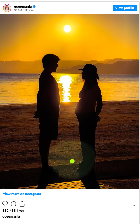 “Both of them are dear to my heart, but the one on the way is even more precious. God willing. Two are a couple; three are a blessing,” Queen Rania captioned the post.