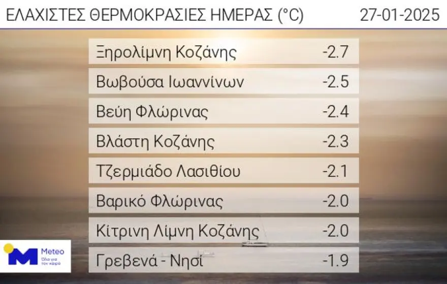 Xirolimni Kozani recorded the lowest temperature at -2.7°C, followed by Vovousa Ioannina (-2.5°C) and Vevi Florina (-2.4°C).
