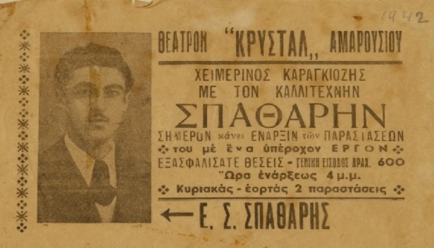 Sotiris Spatharis (1892–1974), born in Santorini and raised in Metaxourgeio, discovered his passion for Shadow Theatre after witnessing a performance by Giannis Brachalis. He quickly became a dedicated Karagiozis performer, balancing his artistic career with construction work. His son, Eugenios Spatharis (1924–2009), followed in his footsteps, immersing himself in the craft from a young age.