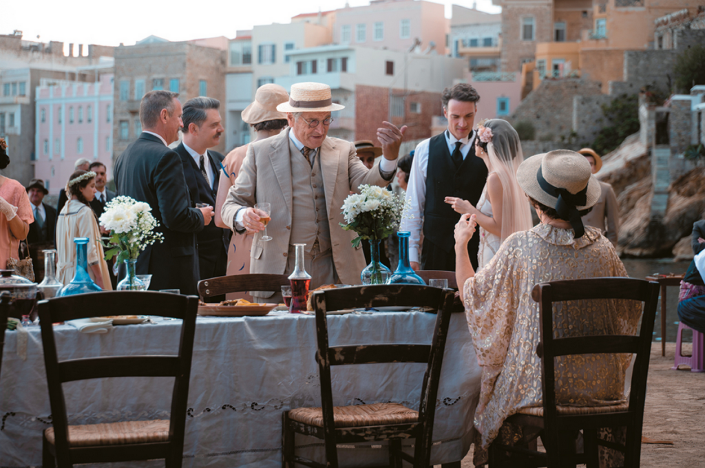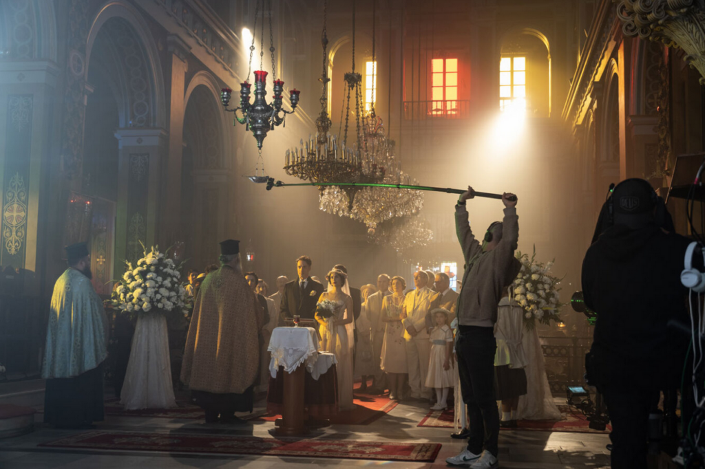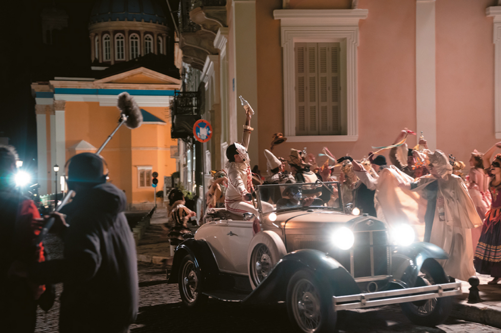 Panepistimiou Street has changed. It has been transformed into a 1930s cityscape, and according to Foss Productions producer Stelios Kotsonis, “In Syros, we didn’t need to do much—it is already a natural set. We wouldn’t have achieved anything without the support of the local government and community. They embraced us, and that was the moment when the book started coming to life. We had a crew of 60 people and dozens of citizens who helped us with the wedding scenes, the carnivals, and the theater sequences.”